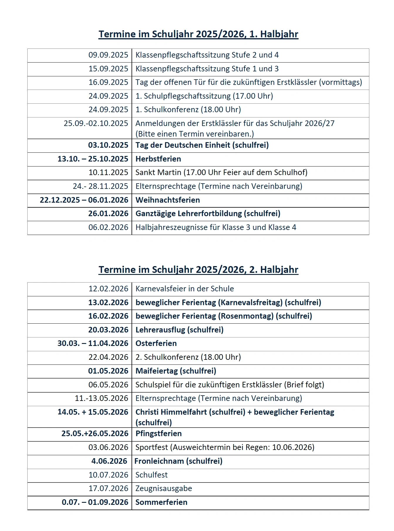 Die Termine und freien Tage gelten ebenso für die OGS. Über die Öffnungszeiten in den Ferien werden Sie von Frau Haas gesondert informiert.