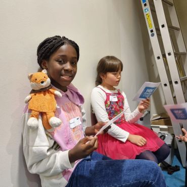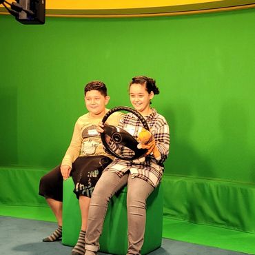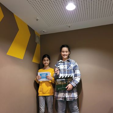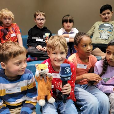 Nach einer kleinen Frühstückspause starteten alle gestärkt mit einem Medienquiz und erfuhren viel über die Arbeit beim Rundfunk. Anschließend durften die Kinder mit dem Green Screen experimentieren, den sie bereits aus dem Unterricht kannten. Beim WDR konnte man natürlich noch viel coolere Dinge mit dem Green Screen erzeugen, z. B. zu SpongeBob in die Unterwasserwelt abtauchen, sich in Hogwarts mit einem Umhang unsichtbar machen oder sogar Auto und Achterbahn fahren! Das war ein Spaß! Danach durften die Kinder gemeinsam eine eigene Nachrichtensendung produzieren. Es gab ein Technikteam, die Regie, Maske und natürlich ein Moderationsteam. Alle haben ihre Aufgabe großartig gemeistert und es ist eine tolle Nachrichtensendung entstanden!
